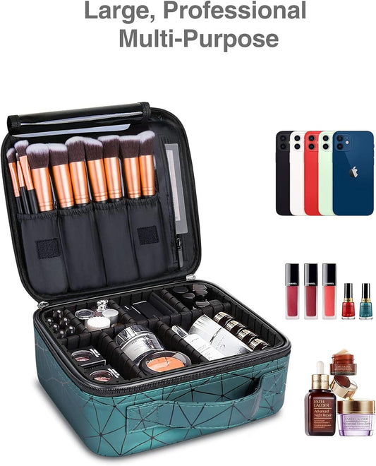 Leather Travel Makeup Train Case, Waterproof Makeup Bag Cosmetic Case Organizer, Large Cosmetic Makeup Case with Adjustable Dividers for Women Cosmetics Brushes Toiletry Jewelry Etc. (Green)